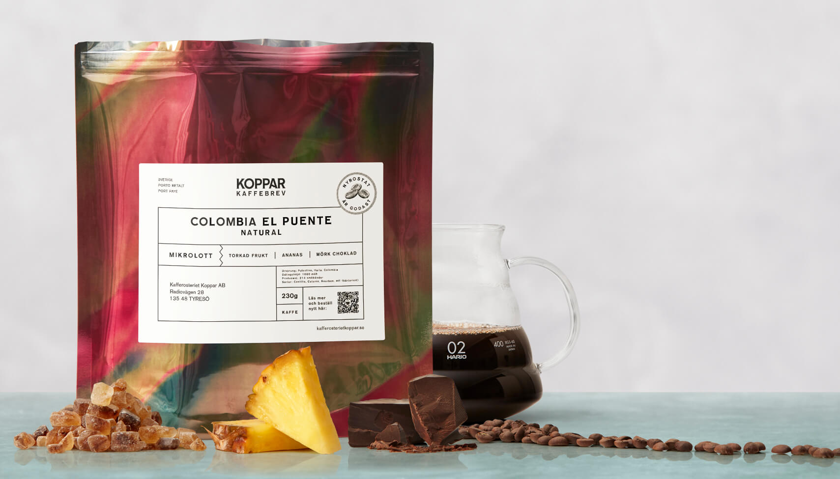 I koppen sprudlar El Puente av torkad frukt – med tydliga toner av aprikos och ananas. Den påminner om en chokladbar fylld med frukt, där sötman, fylligheten och fruktigheten dansar tillsammans i både smak och arom. Ett kaffe med sol i själen – och kraft att stanna kvar i minnet. Vikt: 230g