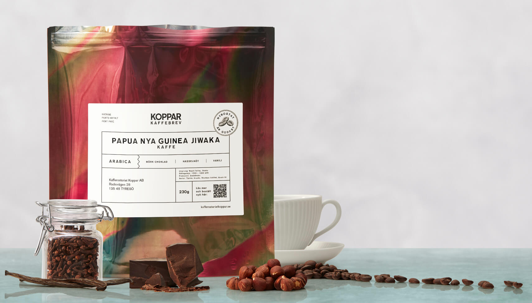 I koppen möter vi en silkeslen, fyllig kropp med mörk choklad och rostad hasselnöt. Bakat plommon ger fruktighet medan brunt socker tillför sötma. Bakkryddor som svartpeppar och en diskret tobakston ger komplexitet. Den mörkrostade koppen är värmande och mustig, med en lång eftersmak. Vikt: 230g
